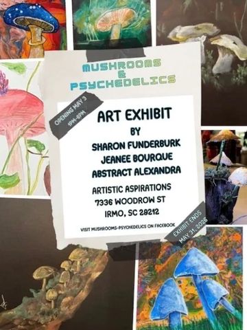 Join us in celebrating the artwork of Sharon Funderburk, Jeanee Borque and Abstract Alexandra! Mushrooms and Psychedelics will be an art show you don't want to miss. Mark your calendars for May 3rd form 1-6pm and come meet the artist, check out their amazing artwork and fellowship.