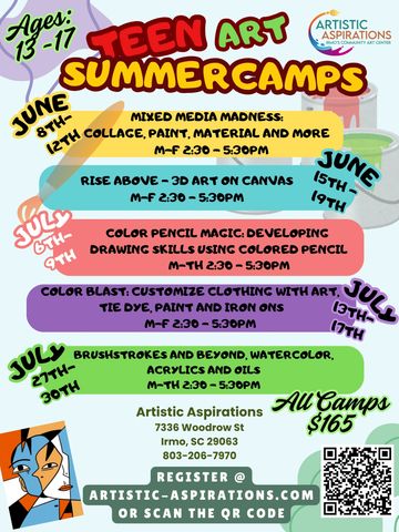 Are your teens looking to be artistic and crafty this summer? Look no further, we are here to help. Our camps provide a safe place to learn, create and explore their artistic talents. We have a wide range of camps and themes that can appeal to any teen artist.